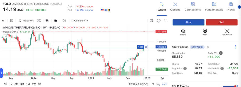 I viewed Amicus as a “stalwart”—a mature company past its hyper-growth phase but still with meaningful upside (roughly 25-40% based on my analysis). Major investor Perceptive Advisors had exited, signaling the explosive phase was likely over, but the fundamentals remained supportive. So we held steadily.